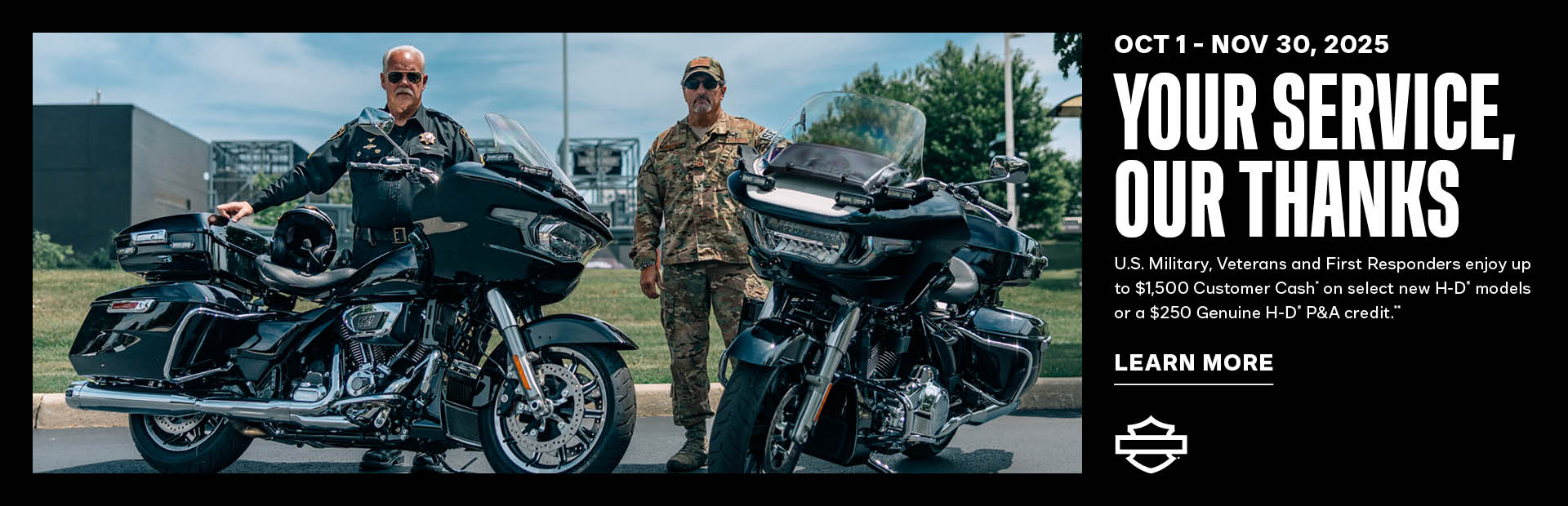 $1,000 incentive valid towards the purchase price of select new, untitled Street Glide and Road Glide motorcycles, $1,500 incentive valid towards the purchase price of select new, untitled Street Glide Ultra motorcycles, or $750 incentive valid towards the purchase price of select new, untitled Pan America 1250 Special motorcycles, all available and in stock at participating H-D dealers in the continental U.S. including Hawaii and Alaska. At participating dealers only. Eligible customers must visit H-D.com/Military or H-D.com/firstrespondersoffer and validate through the ID.me button to receive H-D Hero code. This promotional offer is valid for the named party only and is non-transferable. Offer valid on purchases made on and between October 1, 2025 to November 30, 2025. Offer cannot be used towards the down payment on a motorcycle. Limit one offer per eligible customer and per eligible motorcycle purchase per year. Offer not valid on previous purchases or future motorcycle orders after November 30, 2025. This Offer may not be combined with the $250 Harley-Davidson Genuine Parts and Accessories incentive, but may be combined with certain specific, in-market H-D promotions, but some restrictions apply. Please see your authorized Harley-Davidson dealership to determine what offers, discounts or promotions, such as Harley-Davidson finance offers, can be combined with this Offer. The unique ID.me H-D Hero Offer code must be presented at time of purchase to be eligible. Harley-Davidson and/or dealer are not responsible for lost or stolen offers.  Offer is subject to change at any time without notice. Void where prohibited or restricted by law. Cannot be redeemed for cash or cash equivalent and is non-refundable.